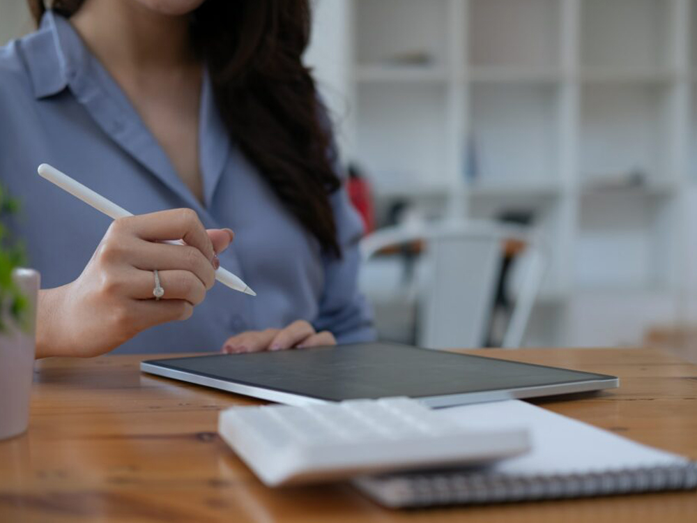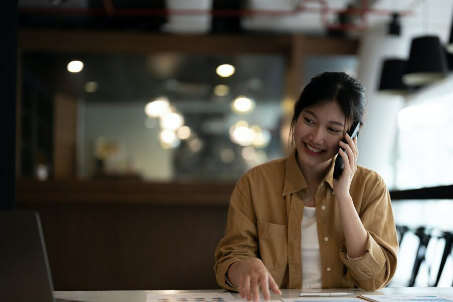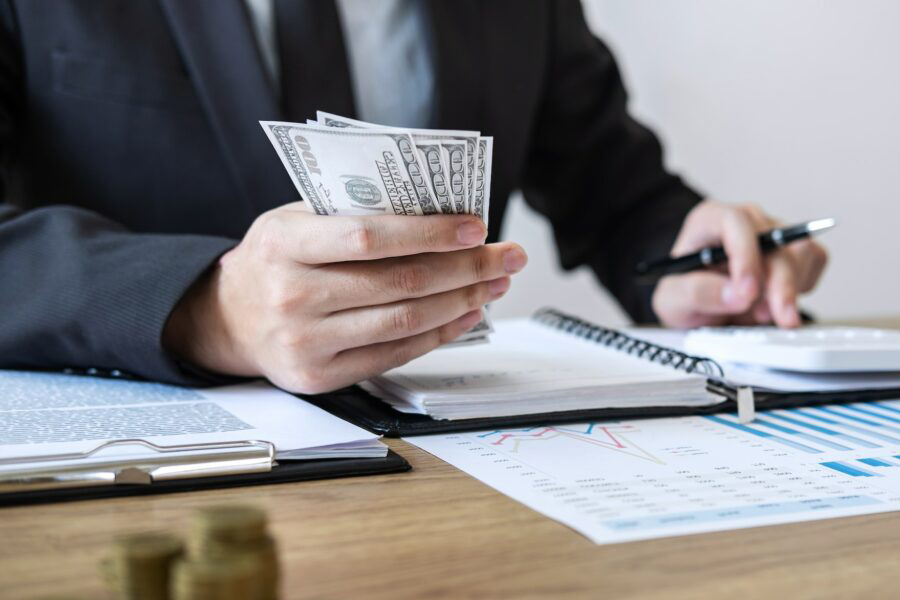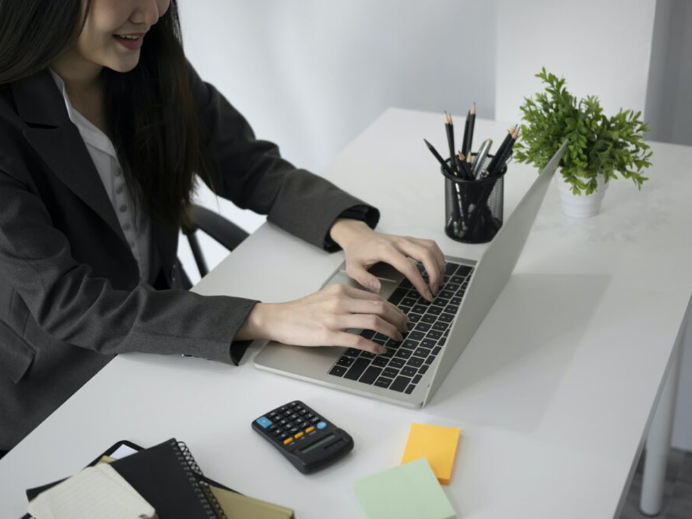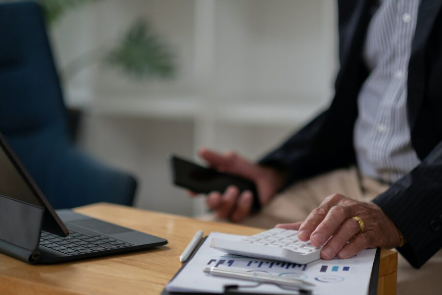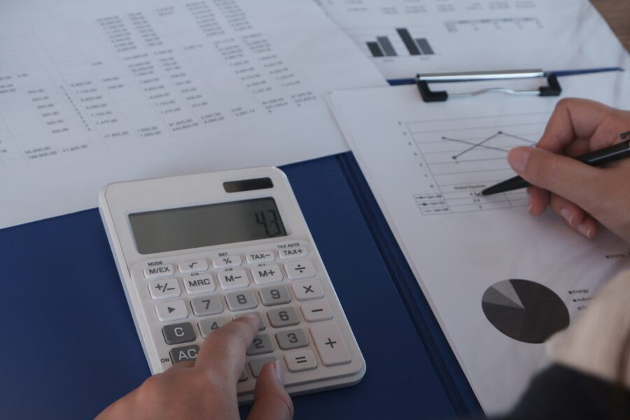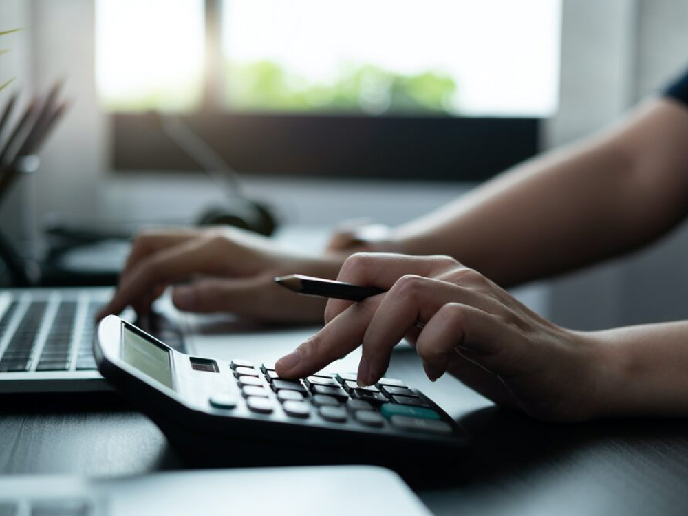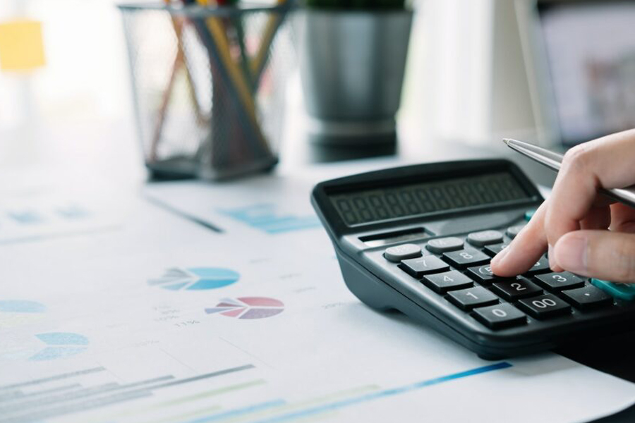 Business accountant woman using calculator for do math finance on wooden desk in office and